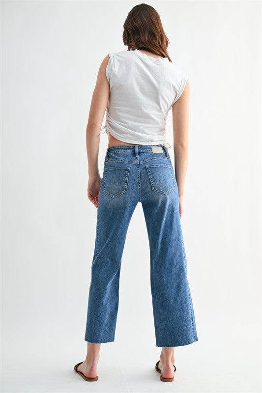 Effortless style meets flattering fit with these mid-rise straight jeans. Designed with a tummy tuck feature for a smooth silhouette, the cropped length and loose fit offer comfortable everyday wear. Raw hem detailing adds an on-trend, relaxed edge to your denim collection. Perfect for pairing with sneakers or boots for a versatile look that transitions seamlessly from casual outings to laid-back weekends.