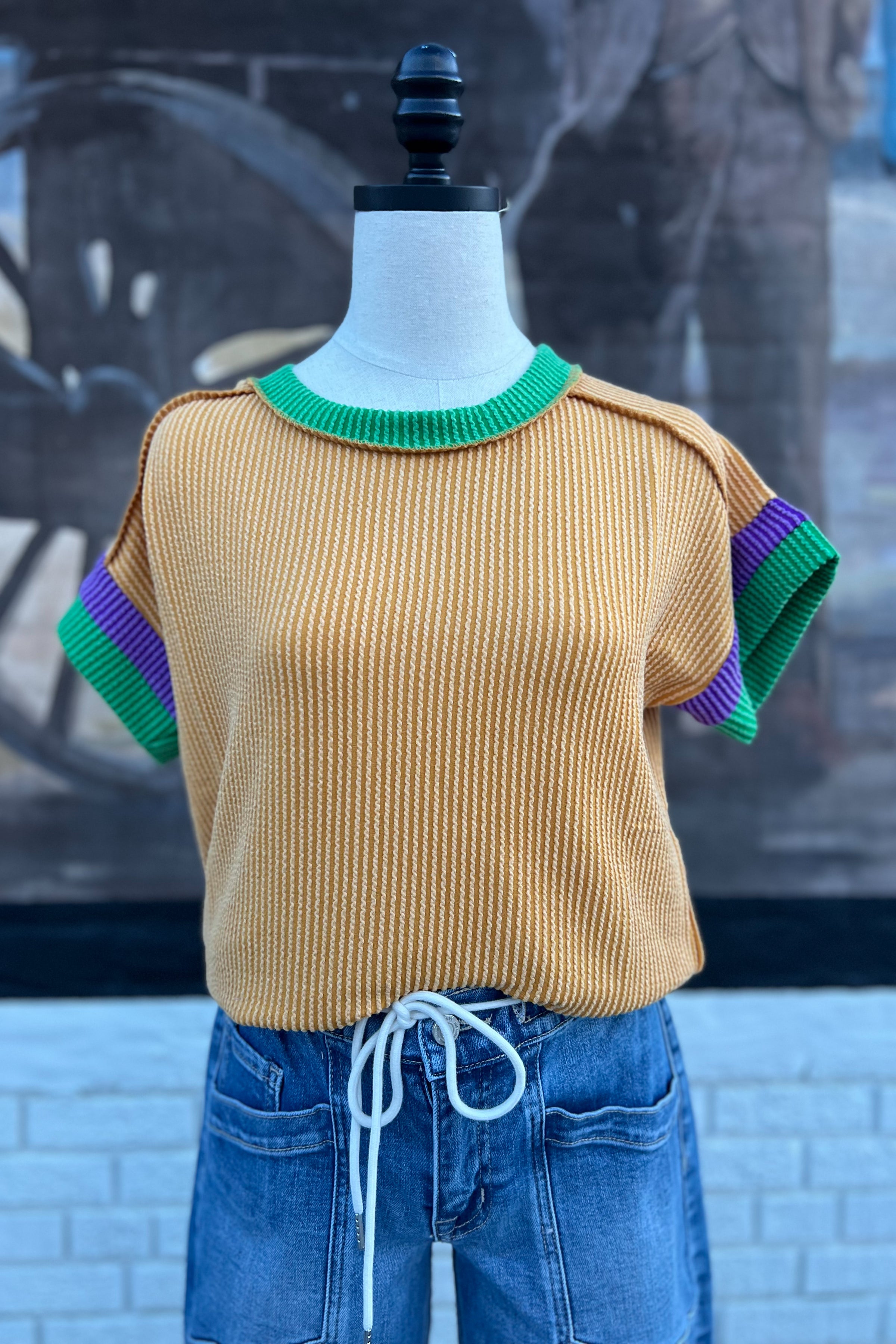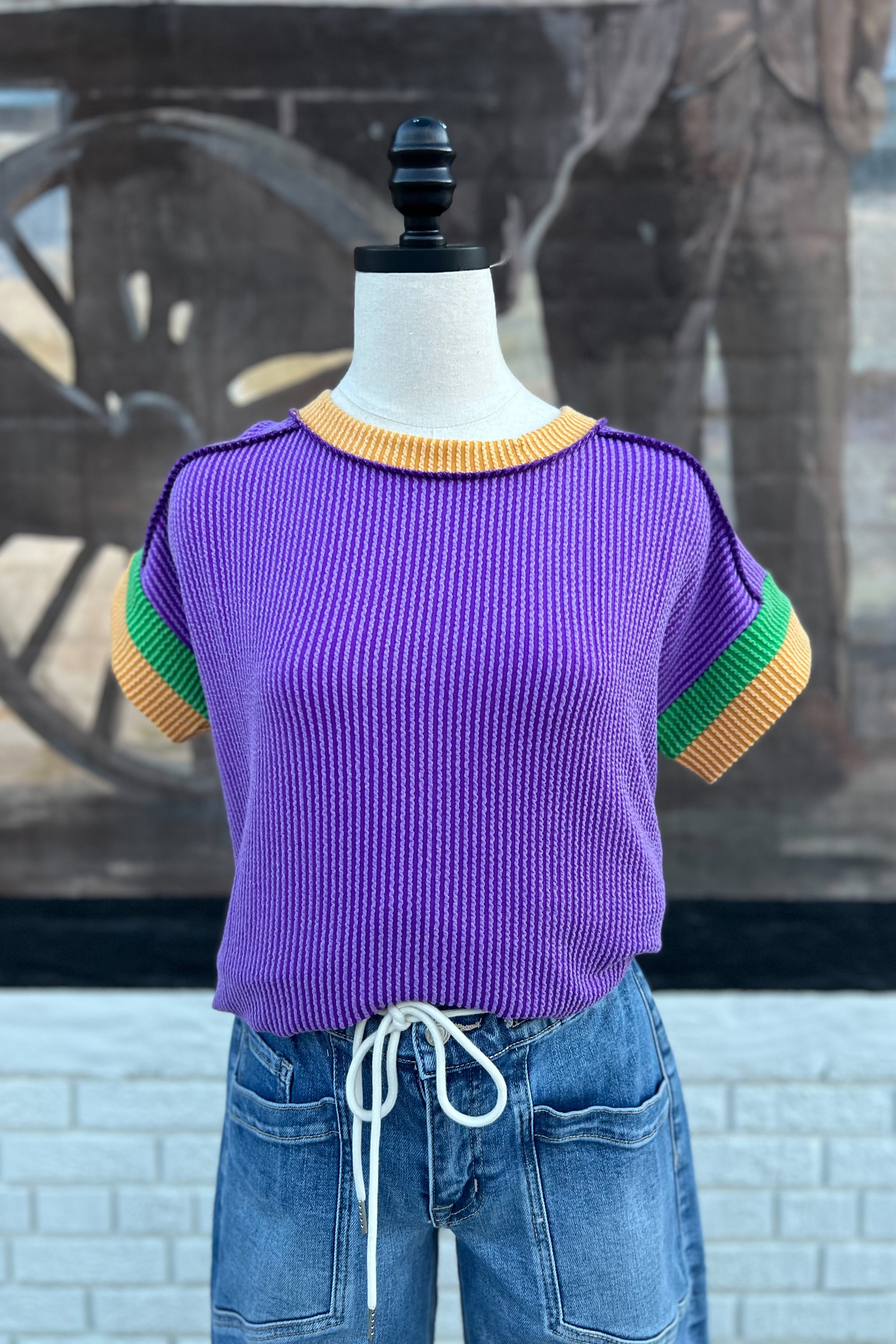 Celebrate every day like Mardi Gras in this playful ribbed top, featuring charming raised rib contrast trim for a fun twist. Crafted from a comfy blend of polyester, rayon, and spandex, it offers just the right stretch for all-day wear. Brighten your wardrobe with a piece that’s as lively and spirited as the festival itself!