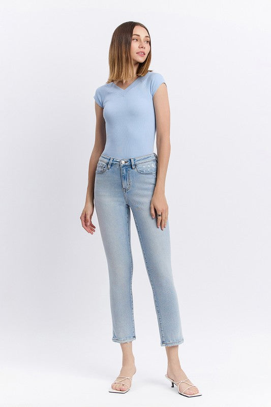 Meet your new go-to pair! These LOVIE High Rise Slim Straight jeans combine flattering style with feel-good comfort. Crafted from stretchy denim, they feature a high-rise waist with built-in tummy control inner panels that smooth and shape your silhouette. The cropped length and slim straight cut create a timeless look, while subtle distressing adds just the right amount of edge. Slip them on and feel confident all day long!