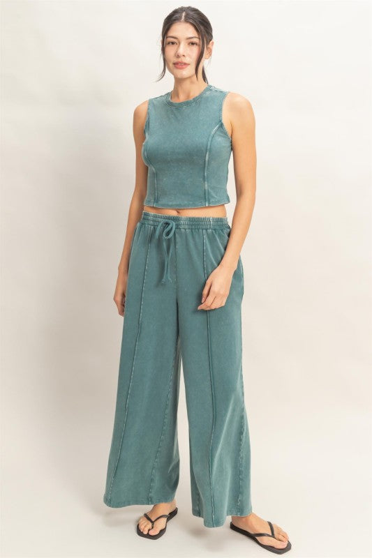 Elevate your casual wardrobe with this effortless two-piece set. The sleeveless, cropped top features a classic ribbed crew neckline and princess lines that create a structured, flattering silhouette. Pair it with the relaxed wide-leg pants, complete with an elastic drawstring waist and functional side pockets. Enhanced with a mineral wash treatment for a soft, lived-in aesthetic, this set strikes the perfect balance between comfort and style. Throw on clean trainers and you're ready for a laid-back day out.