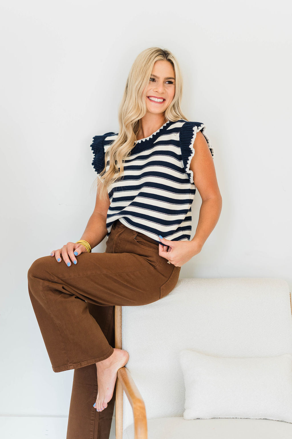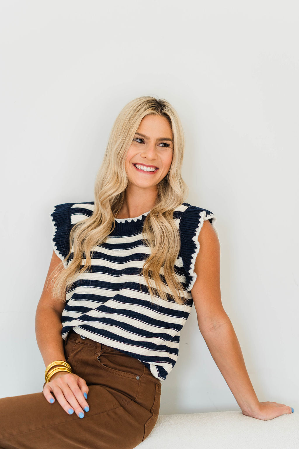 The ERIN SWEATER combines delicate style with cozy comfort. Featuring ribbed short flutter sleeves and a ribbed round neckline, it offers a soft, flattering fit. The striped design enhances its visual appeal, while the triangle blanket stitch detail on the neckline, sleeves, and hem adds a unique handcrafted touch. Perfect for elevating casual looks with a touch of feminine charm.