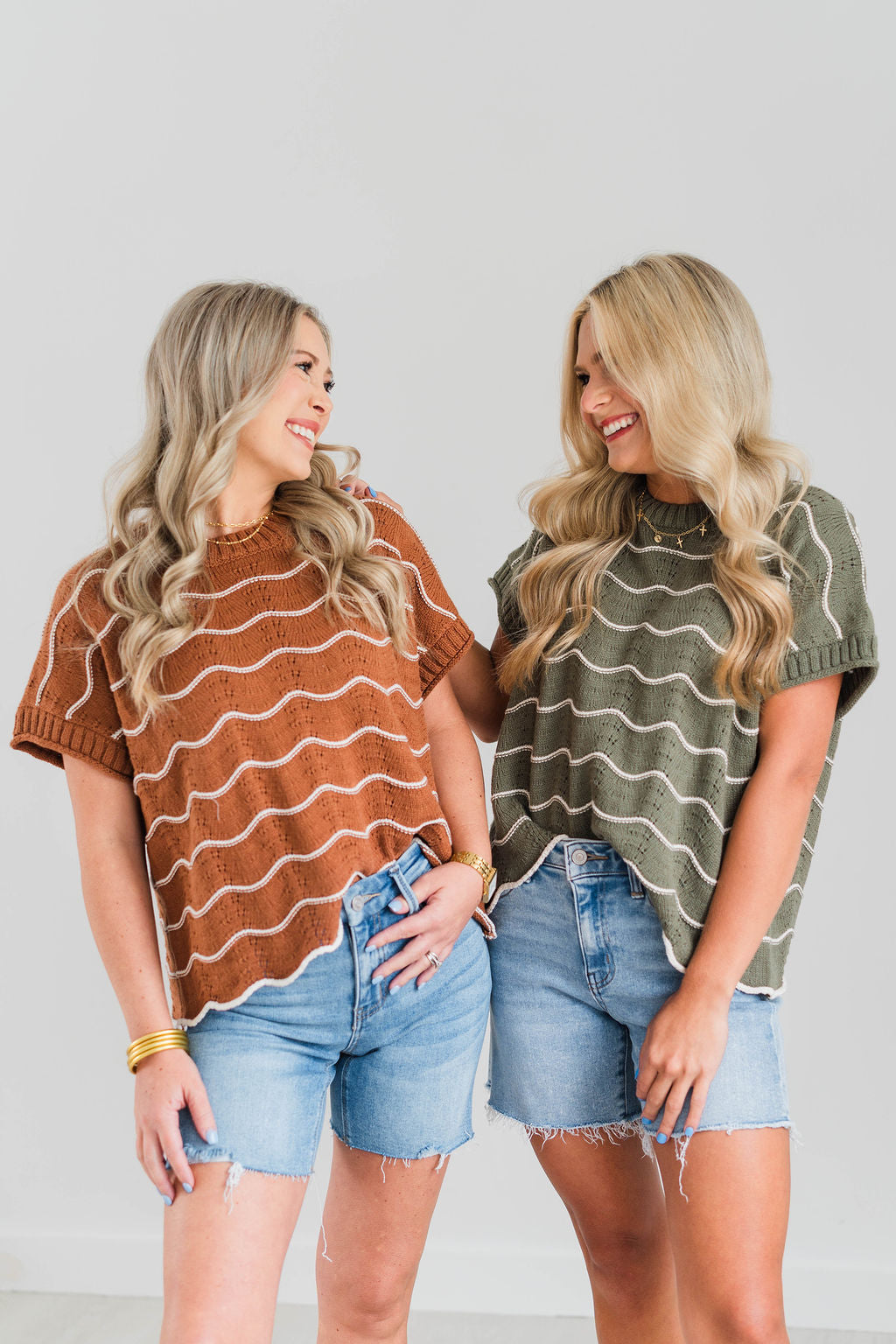 The NYRA Sweater features a sophisticated scalloped edge and a classic striped pattern, crafted from soft knit fabric for comfortable wear. Its short sleeves make it ideal for transitional weather, offering both style and versatility. Perfect for layering or wearing on its own, this top combines timeless design with expert craftsmanship for a polished look.