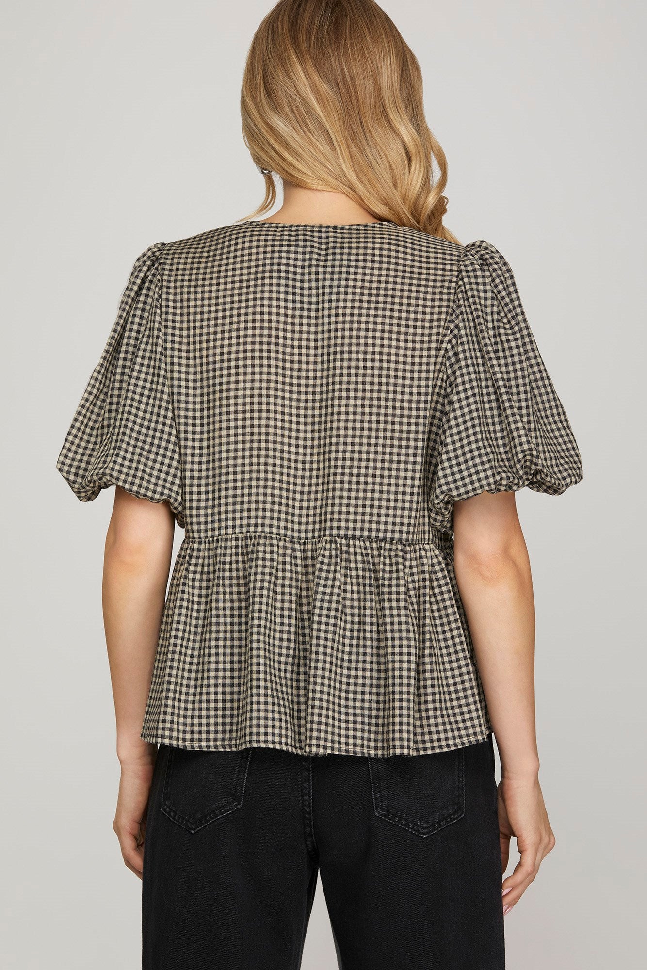Puff short sleeve front bow tie woven flock printing baby doll top.