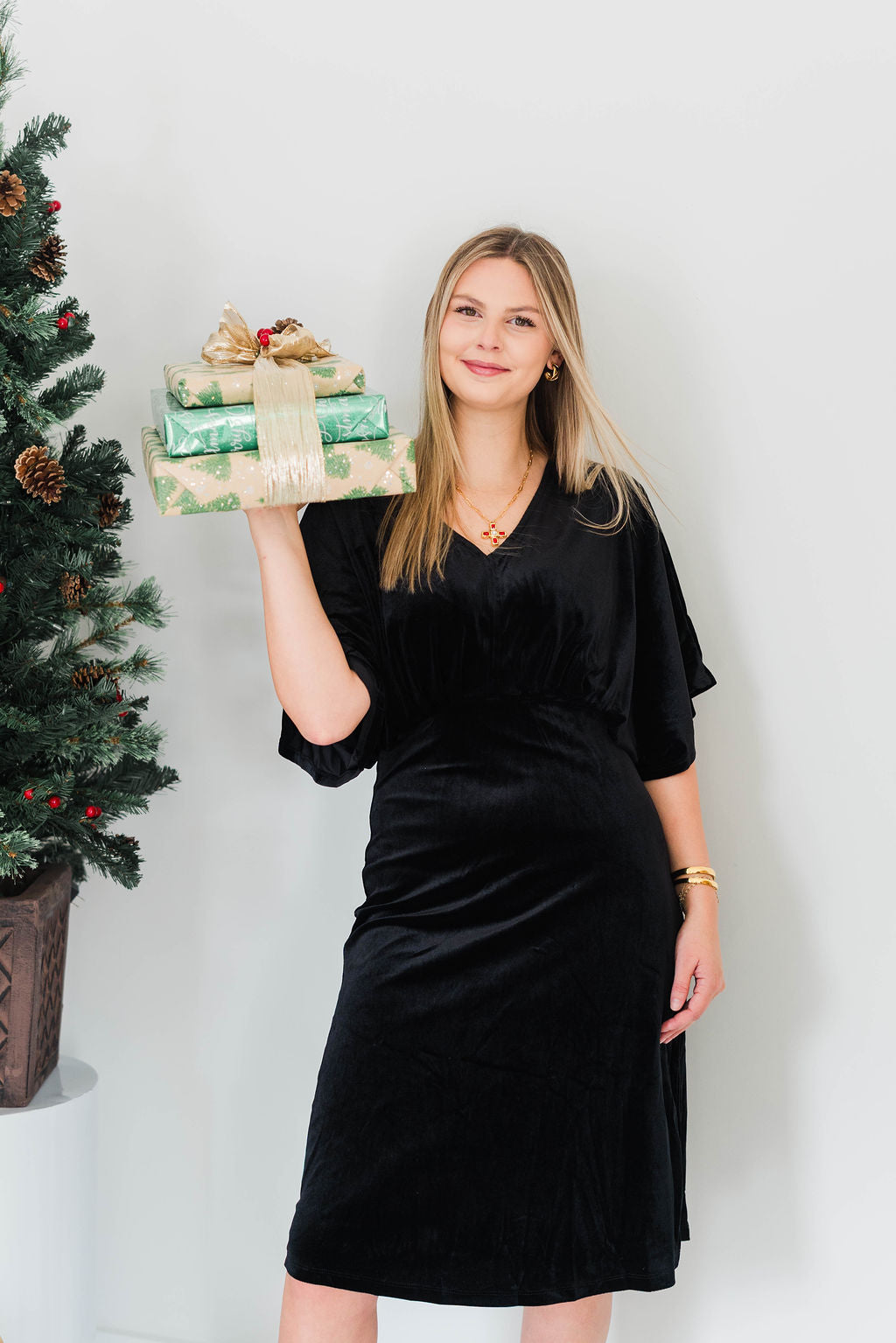Slip into effortless elegance with the Neona Dress—a velvet midi that whispers sophistication. The kimono sleeves add a touch of drama and movement, while the flattering V-neckline keeps things chic and timeless. Luxuriously soft velvet hugs you in all the right ways, making this your go-to piece for everything from dinner dates to gallery nights. Dress it up with heels or down with sneakers—this versatile beauty plays well with others.